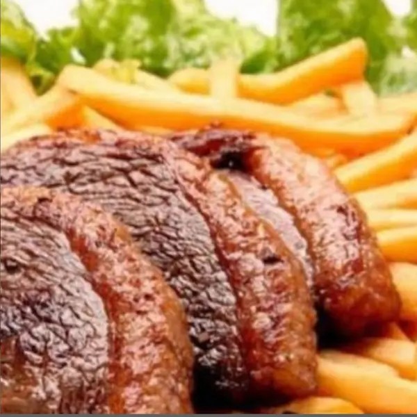 400 gramas de Contra-file acebolado acompanhado de 400 gramas de batata frita