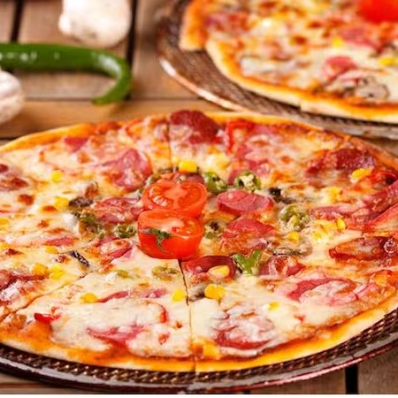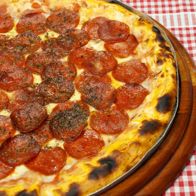 Mussarela presunto, frango, bacon, Catupiry, ovo, milho, cebola, pimentão, champignon, palmito, calabresa, tomate, bacon e azeitona