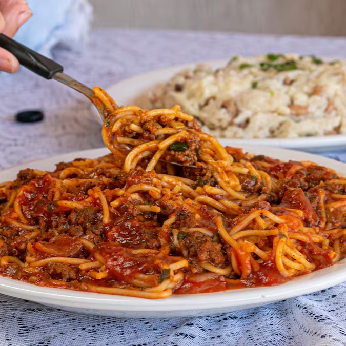 Espaguete, molho a bolonhesa, musssarela, Catupiry, milho e parmesão.