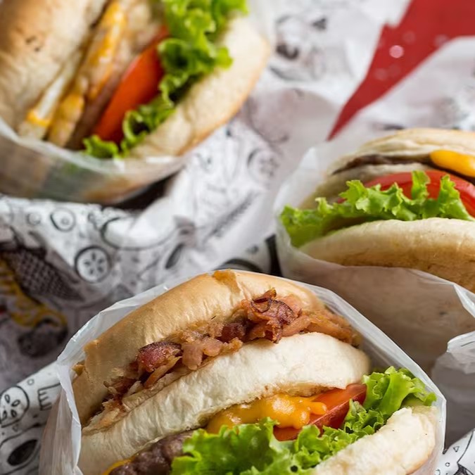 Pão, hambúrguer, bacon, mussarela, ovo, alface, tomate, milho e batata.