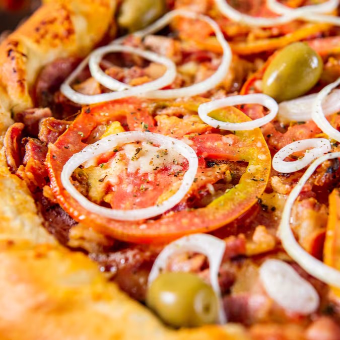 Mussarela, Presunto, Bacon, Calabresa, Pimentão, Cebola, Milho, Azeitona