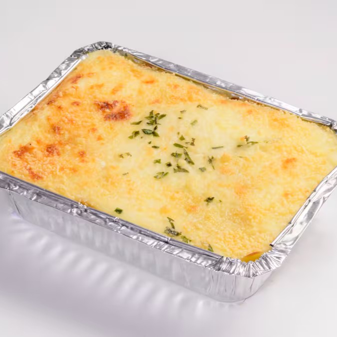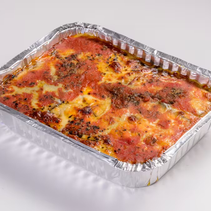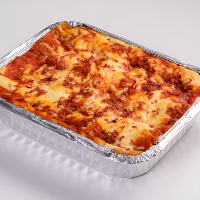 Mussarela, presunto, massa de lasanha, parmesão e molho a bolonhesa.