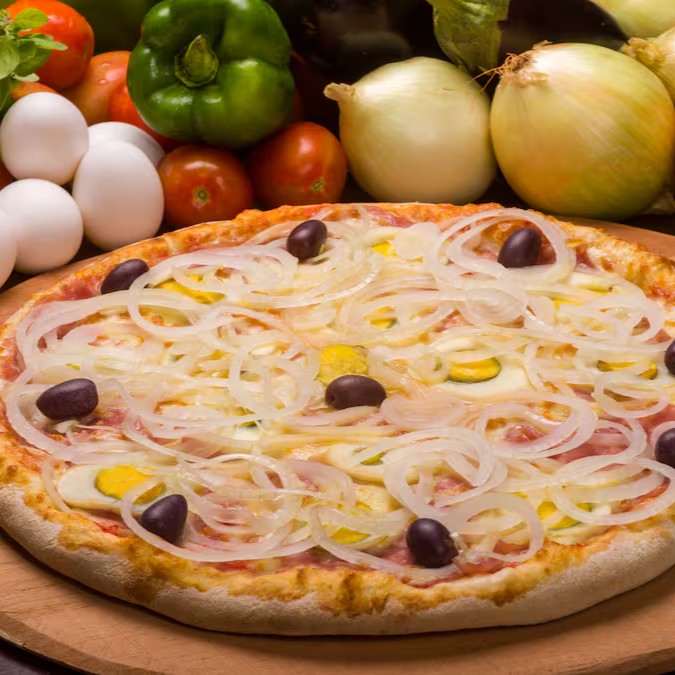 Presunto, Mussarela, Cebola, Ovos, Bacon e Azeitona