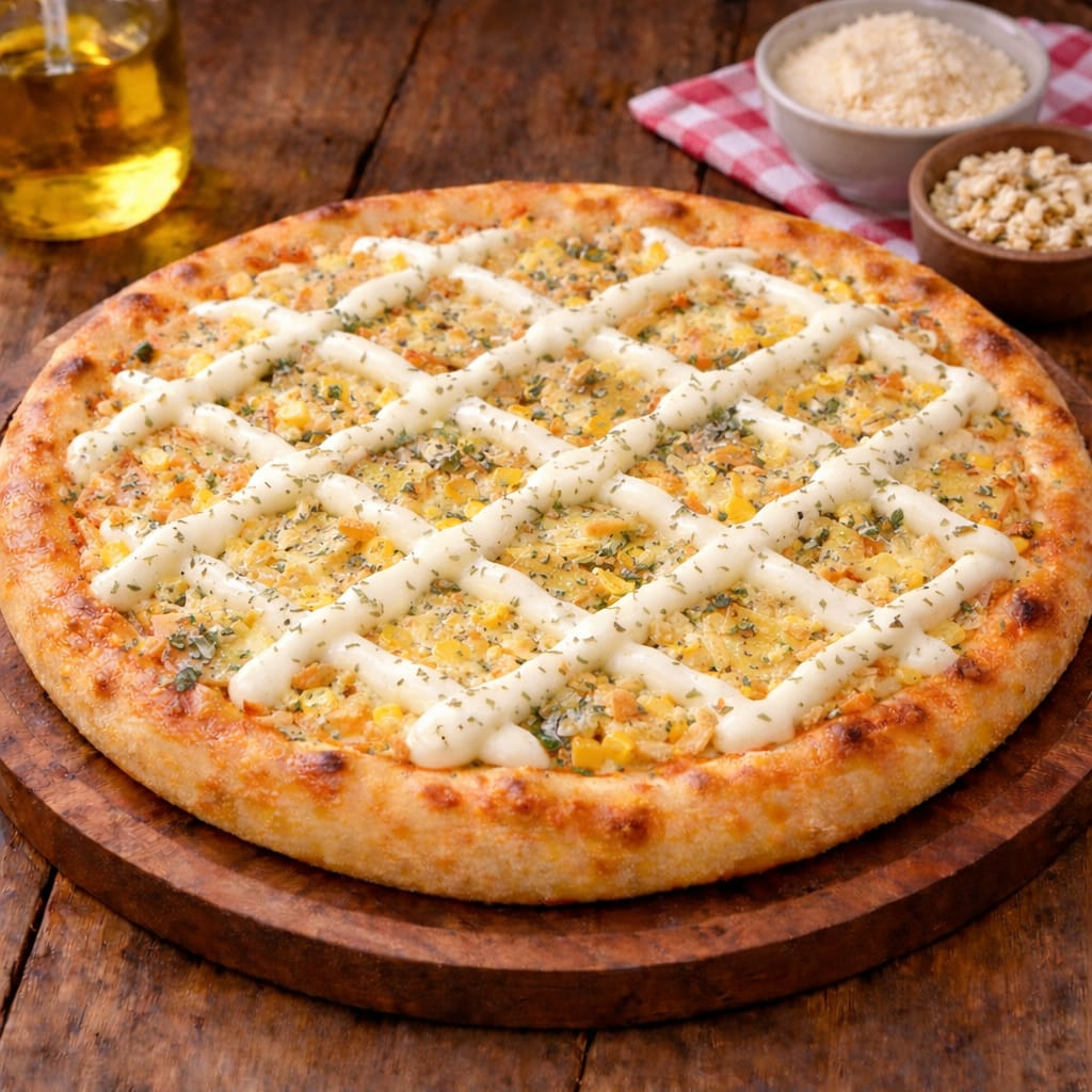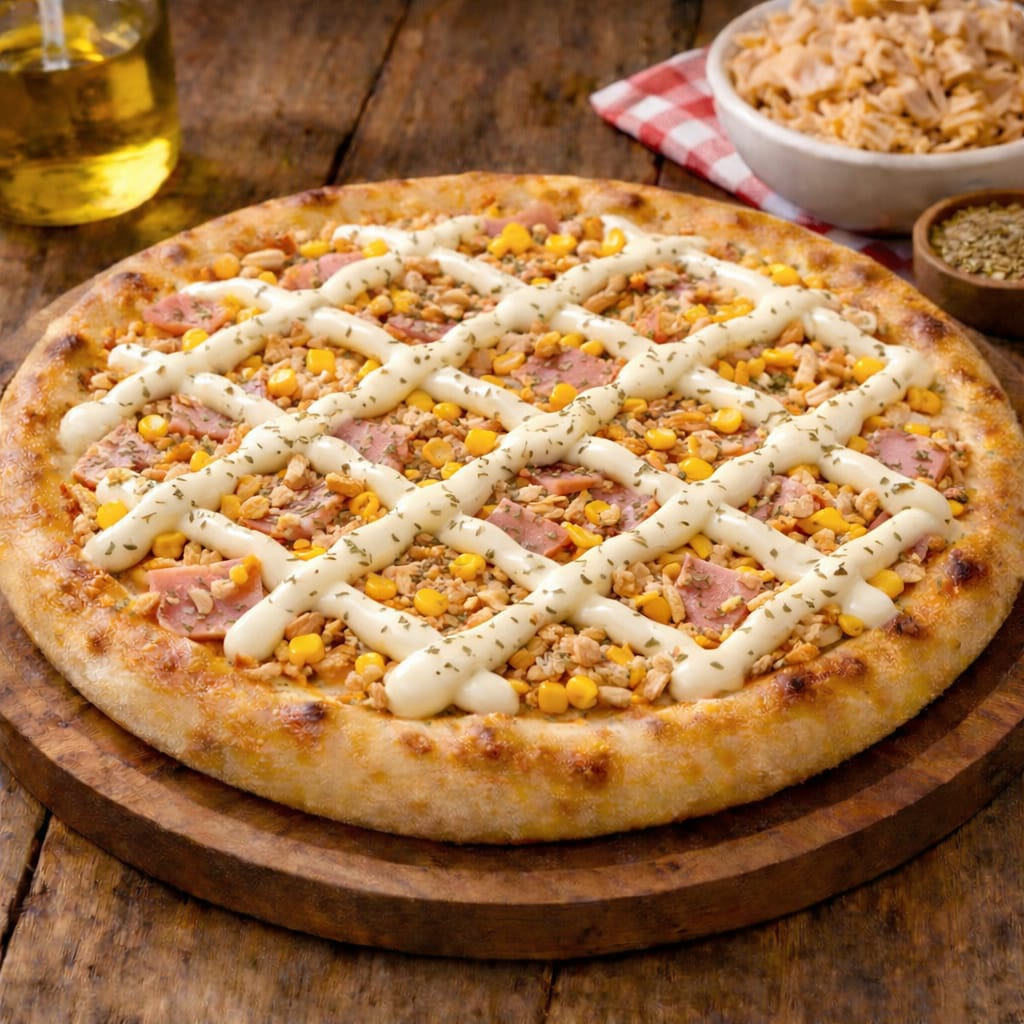 molho, mussarela, presunto, frango desfiado, requeijão, original, milho, azeitonas.