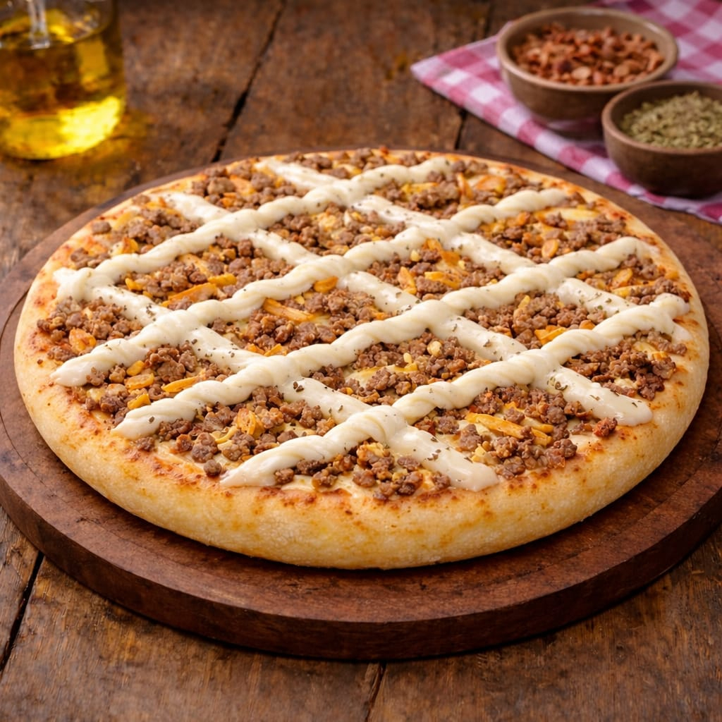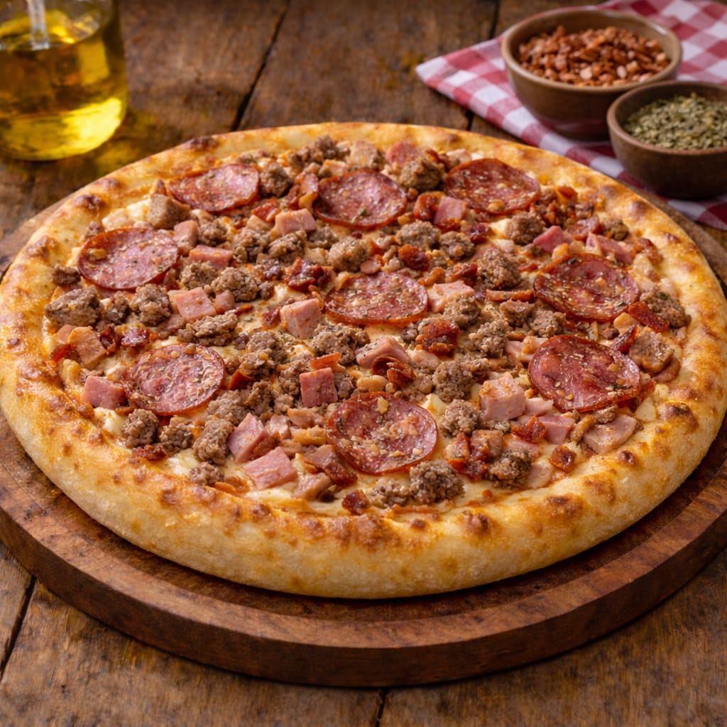 molho, mussarela, presunto, calabresa, bacon, frango desfiado, cebola, lombo canadense, orégano, azeitonas.