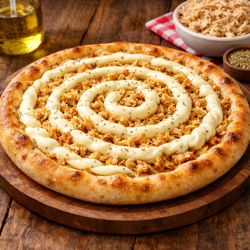 molho, mussarela, frango desfiado, requeijão azeitonas, orégano.