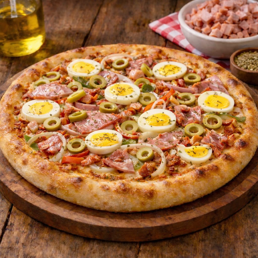 molho, mussarela, presunto, calabresa, bacon, ovos, tomate, cebola, pimentão, orégano, azitonas.