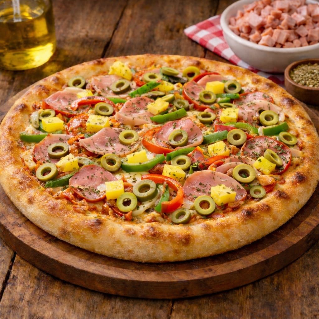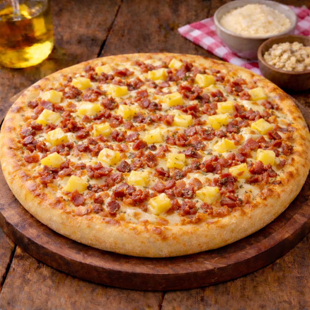 molho, mussarela, presunto, abacaxi, bacon, azeitona, orégano.