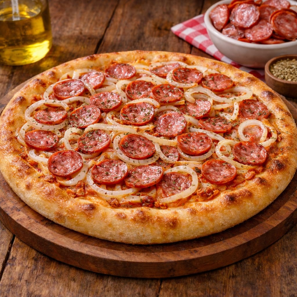 Delicie-se com a nossa saborosa 'Calabresa', um prato irresistível da categoria 'Promoção Relâmpago'. Esta maravilha gastronômica é composta por um generoso molho ao sugo, feito com tomates selecionados e preparado com muito amor. Coberta com uma camada de mussarela derretida de alta qualidade, essa delícia é realçada com fatias de calabresa suculentas e cebola crocante. Para finalizar, o toque especial fica por conta do orégano fresco e azeitonas verdes, acrescentando um sabor único e inconfundível. Experimente e se apaixone!