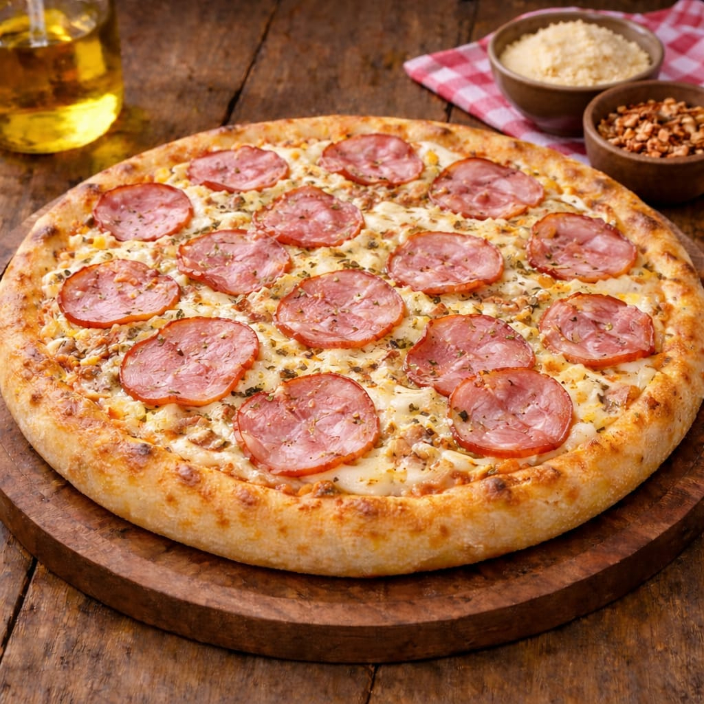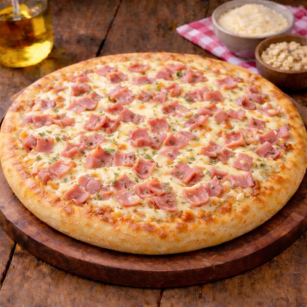 molho, mussarela, presunto, bacon, milho, azeitonas, orégano.