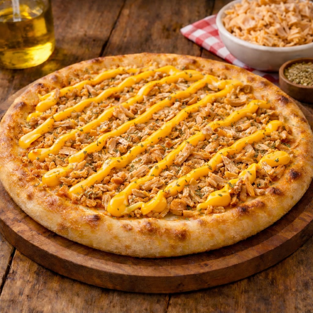 molho, mussarela, frango desfiado, cheddar, azeitonas, orégano.
