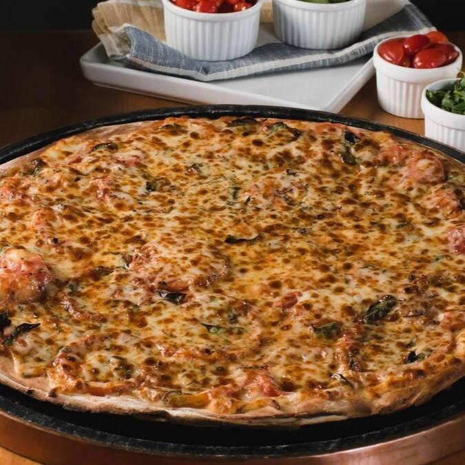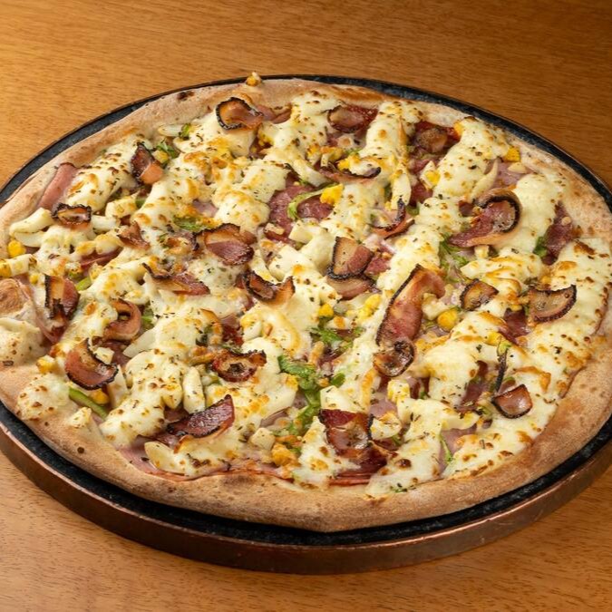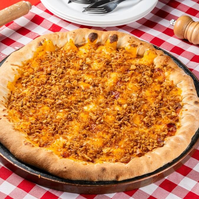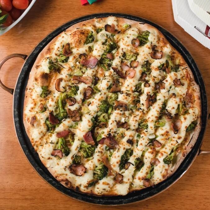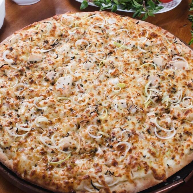 Molho de tomate, muçarela, peito de peru, alho-poró, creamcheese e bacon.