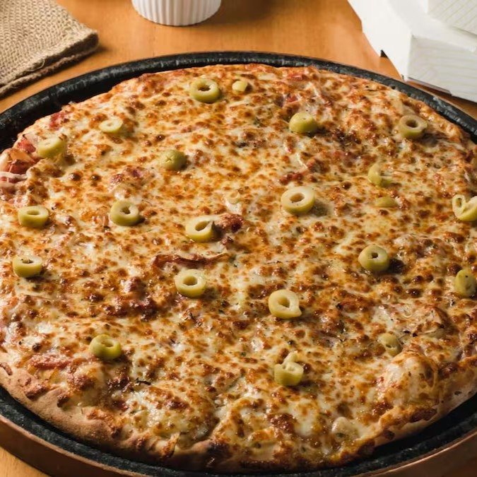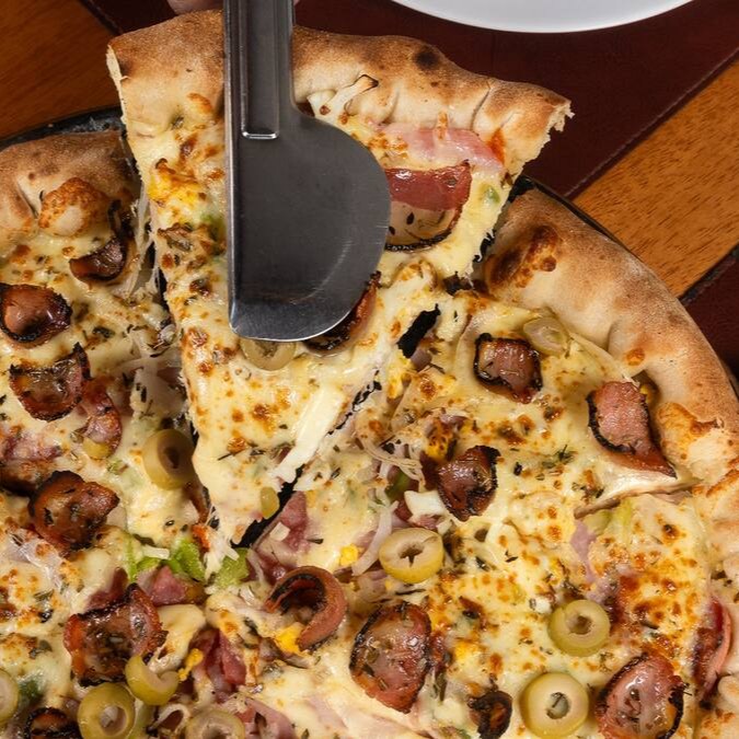 Nossa pizza de calabresa é feita com nossa massa tradicional de pizza, molho de tomate, muçarela, calabresa, cebola, muçarela, azeitona e orégano.