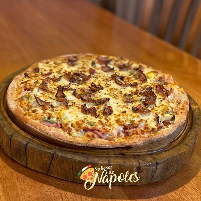 Molho de tomate, presunto, bacon, calabresa, ovos, pimentão, cebola, muçarela, azeitona e orégano.