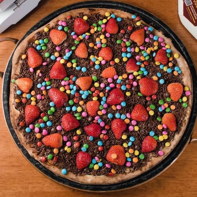 Creme de leite, chocolate ao leite, morango, granulado e Confete