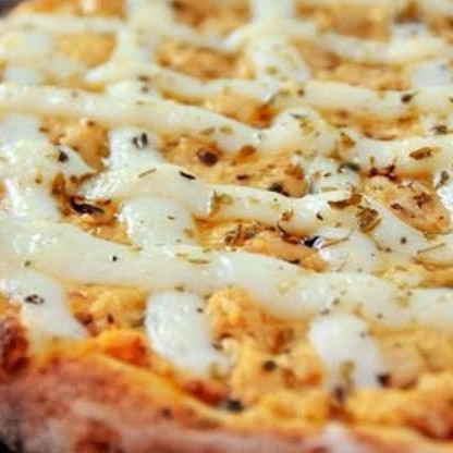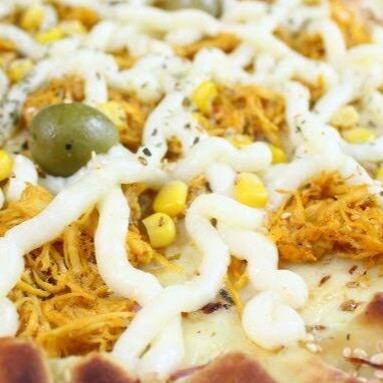Molho ao sugo, muçarela, frango desfiado, palmito, milho, Catupiry e alho frito