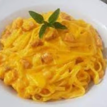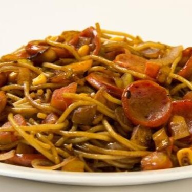 Macarrão,calabresa,bacon,molho shoyo e cheddar.