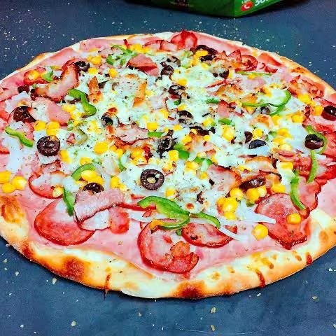 Molho ao sugo, muçarela, lombinho canadense, frango desfiado, milho, Catupiry e alho frito.