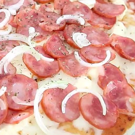 Molho ao sugo, muçarela,calabresa,cebola e orégano