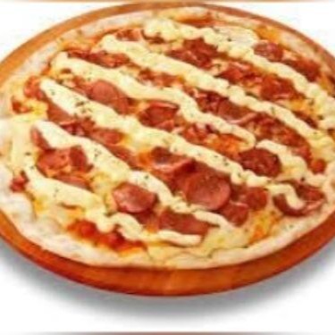 Molho ao sugo, muçarela, frango desfiado, cheedar, milho, presunto, calabresa e alho frito.