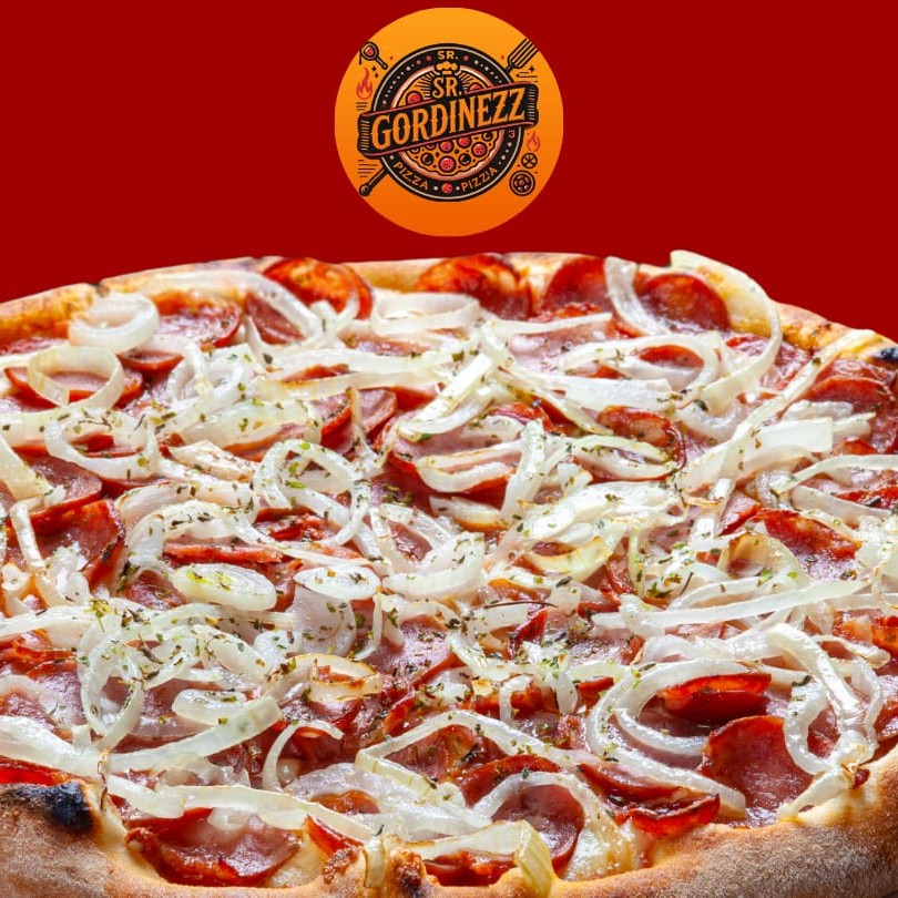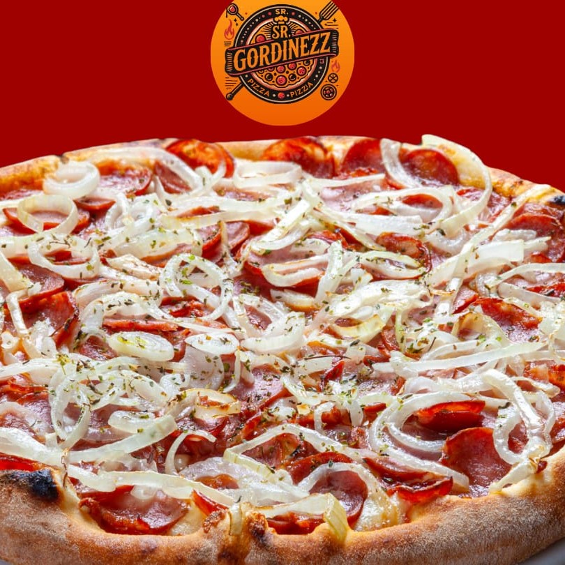 Molho ao sugo artesanal, camada de calabresa, rodelas de cebola, mozzarela e orégano. (Vale retirar a cebola caso não goste, ok?)