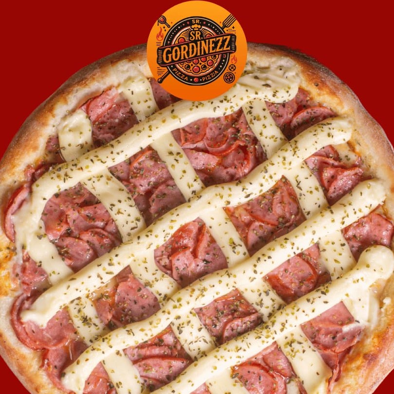 Molho ao sugo artesanal, camadas de calabresa, cheddar cremoso, muçarela e orégano.