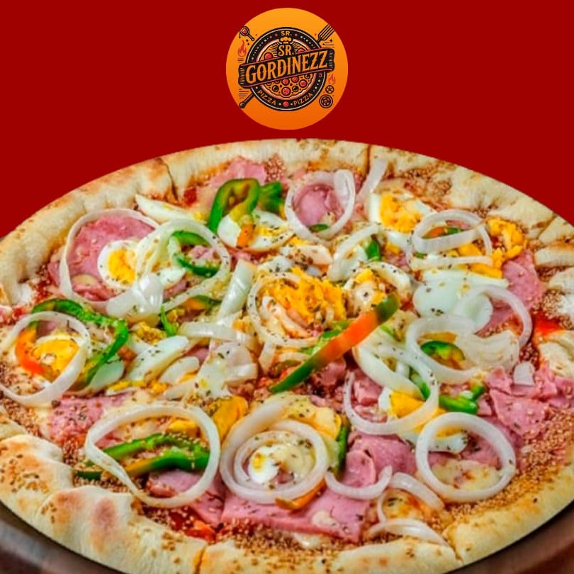 Molho ao sugo artesanal, Camadas de Calabresa, Presunto, Bacon, Azeitonas, Rodelas de Cebola, Pimentão, Ovo cozido, Muçarela e orégano. (Vale retirar a cebola caso não goste, ok?)