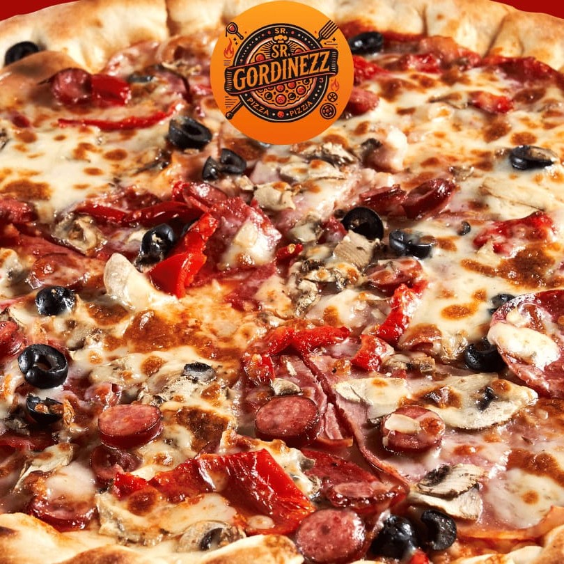 Molho ao sugo artesanal, Presunto, Camadas de Calabresa, Frango temperado e desfiado, Lombinho canadense, Bacon, Muçarela e orégano.