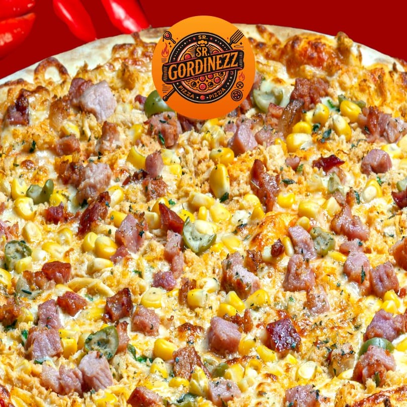 Sucesso Do Momento: Deliciosa pizza com molho ao sugo artesanal, milho, camada suculenta de bacon, muçarela e orégano.