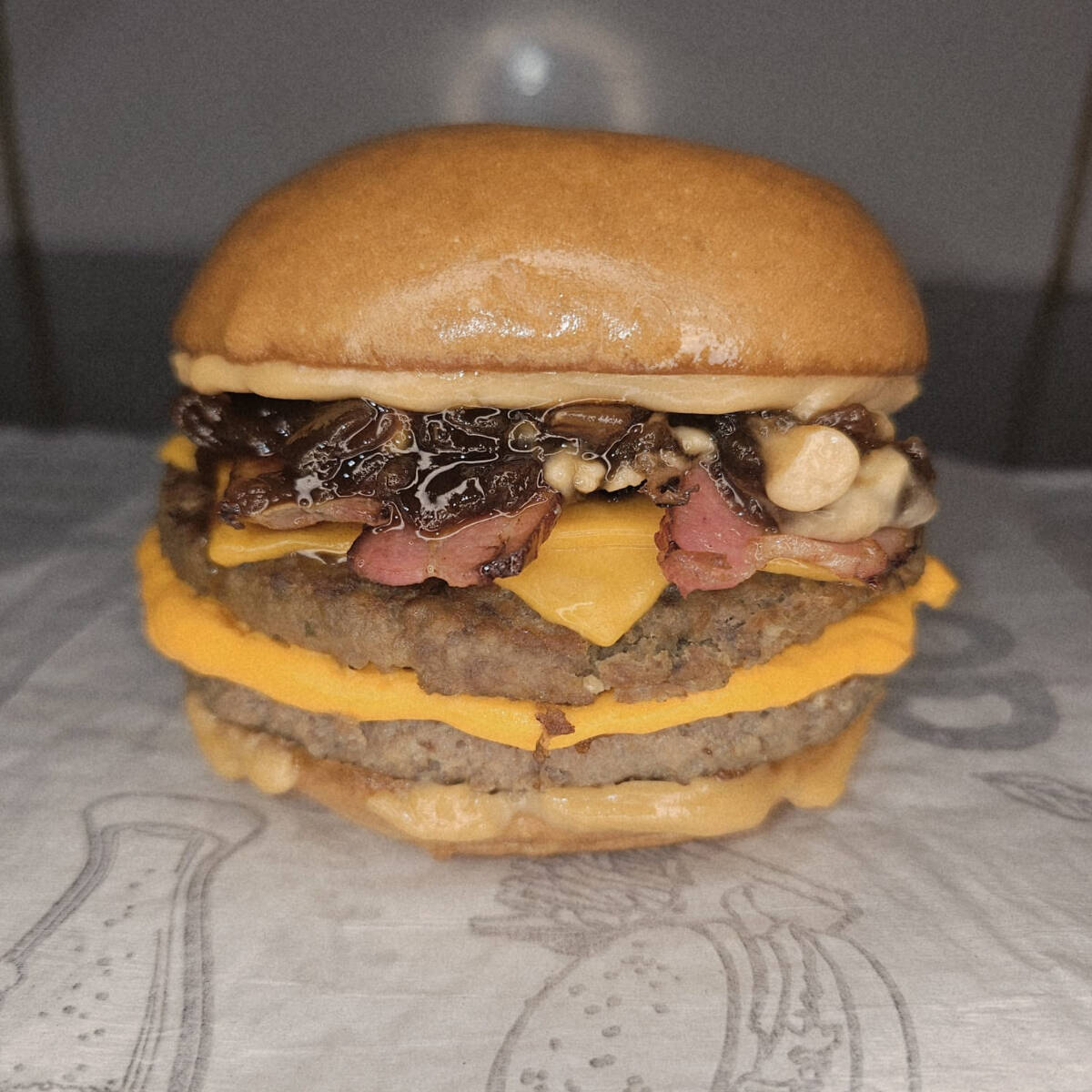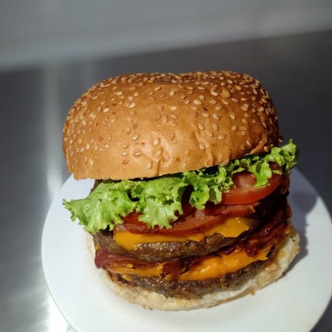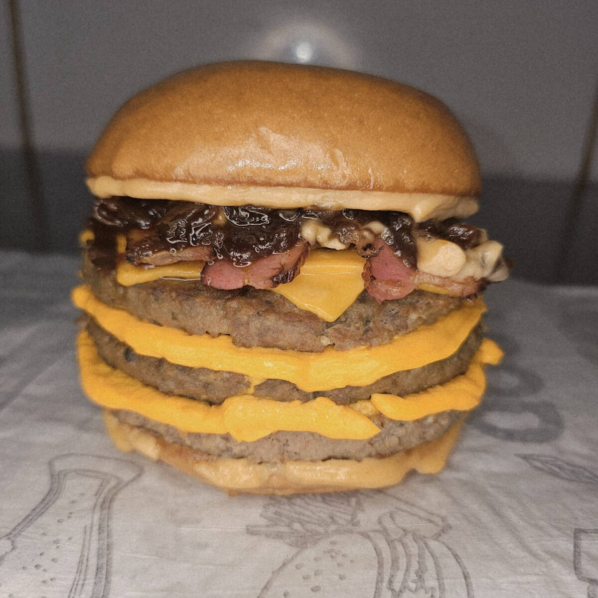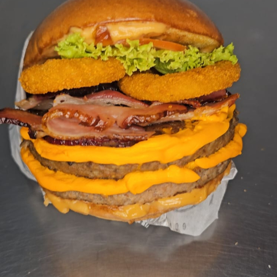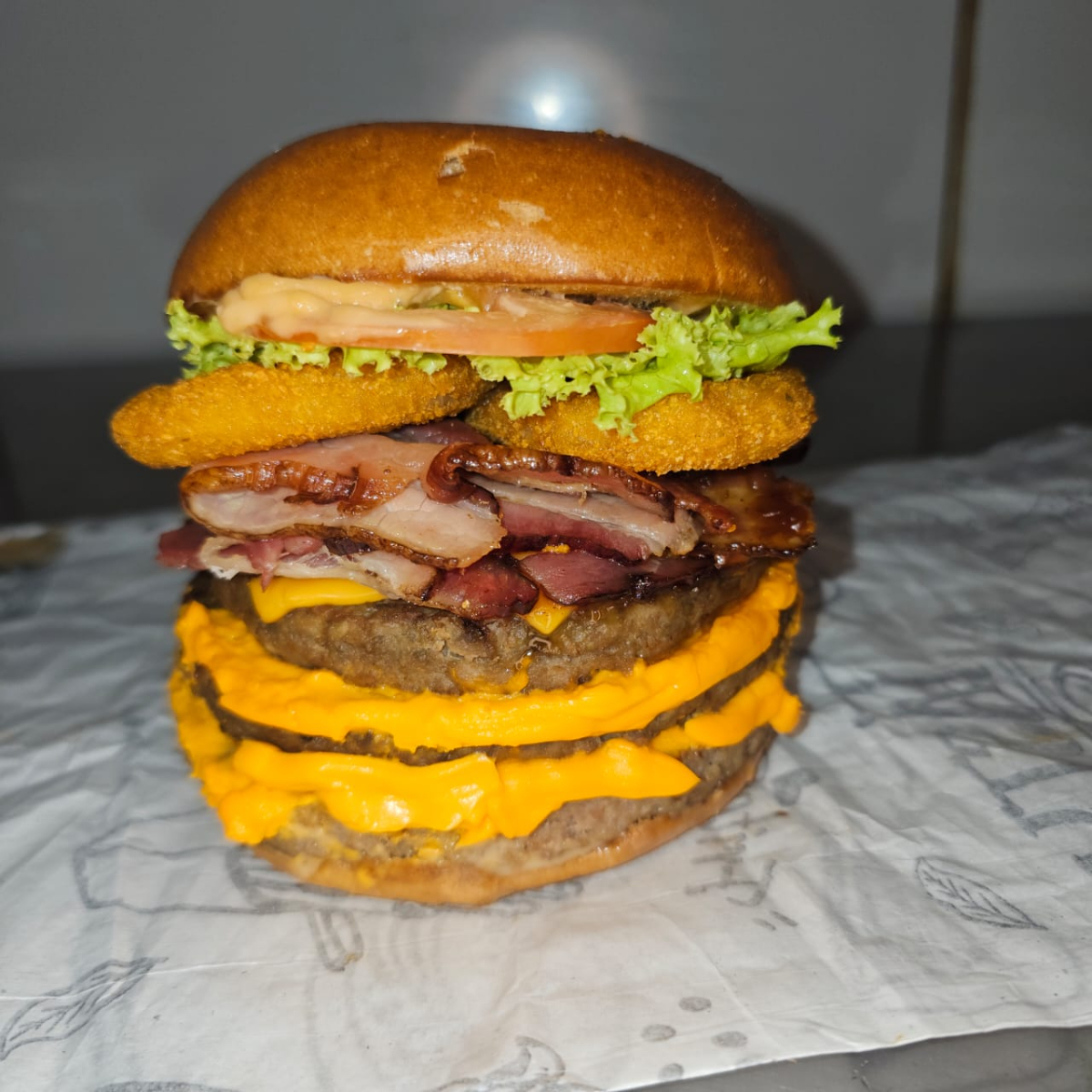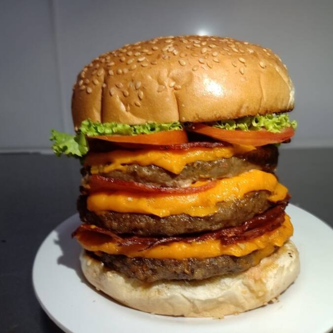 Pão macio, 3 carnes de picanha de 120g,cheddar, bacon triplo e salada fresquinha