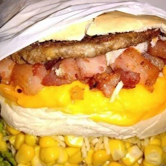 Pão, carne de boi, ovo, queijo, bacon crocante, milho, batata palha e salada fresquinha