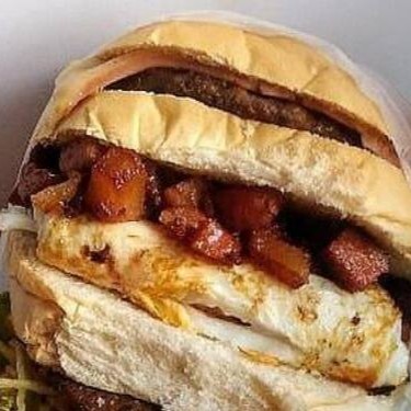 Pão, carne de boi, ovo, queijo, bacon, milho, batata palha e salada