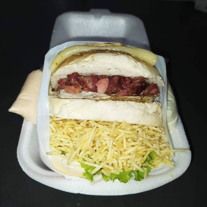 Pão macio, carne de boi, milho, batata palha e salada fresquinha.