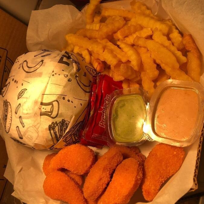 1 sanduiche, batata frita, nugguets, 3 molhos, coca cola 200ml