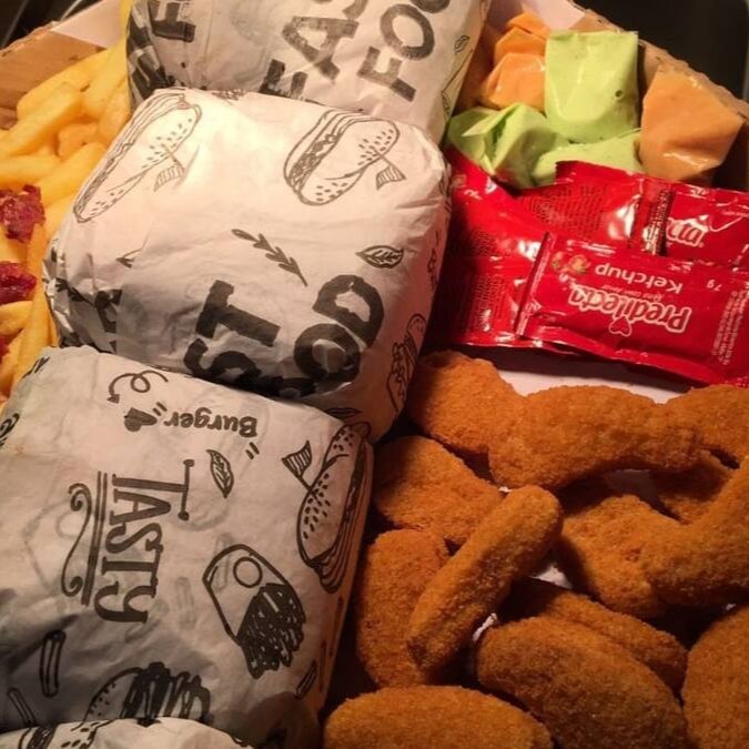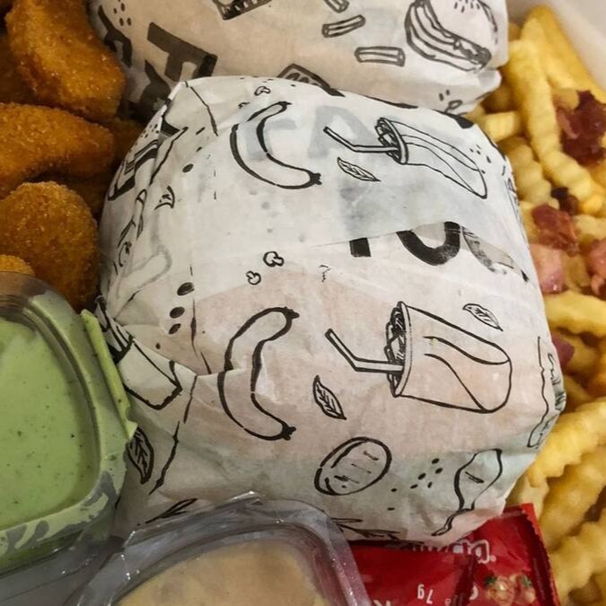 4 sanduiches, batata frita, nugguets, 3 molhos, refrigerante Mate couro 2l