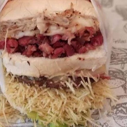 Pão, carne de boi, ovo, queijo, bacon crocante, presunto, milho, batata palha e salada fresquinha.