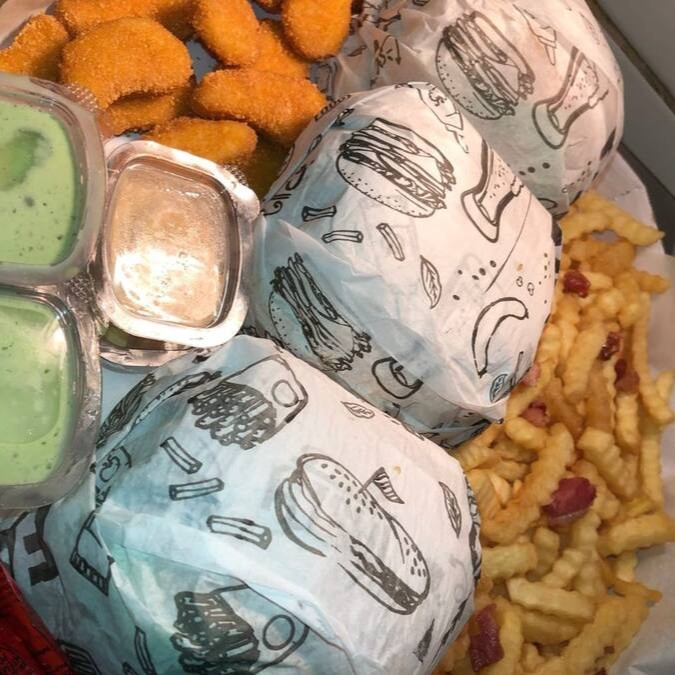3 sanduiches, batata frita, nugguets, 3 molhos, refrigerante Mate couro 2l
