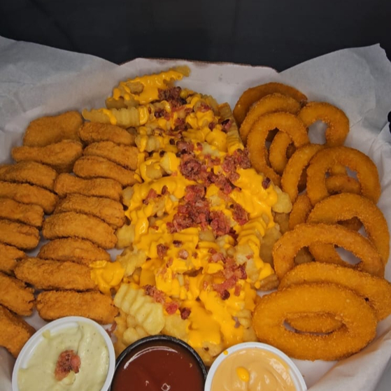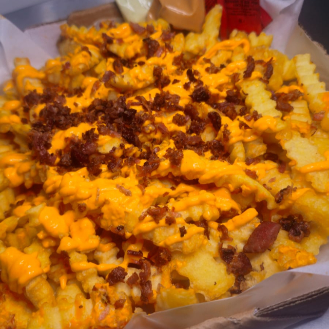 10 un de nugguets + batata fritas +7 un de anel de cebola +chedda e bacon