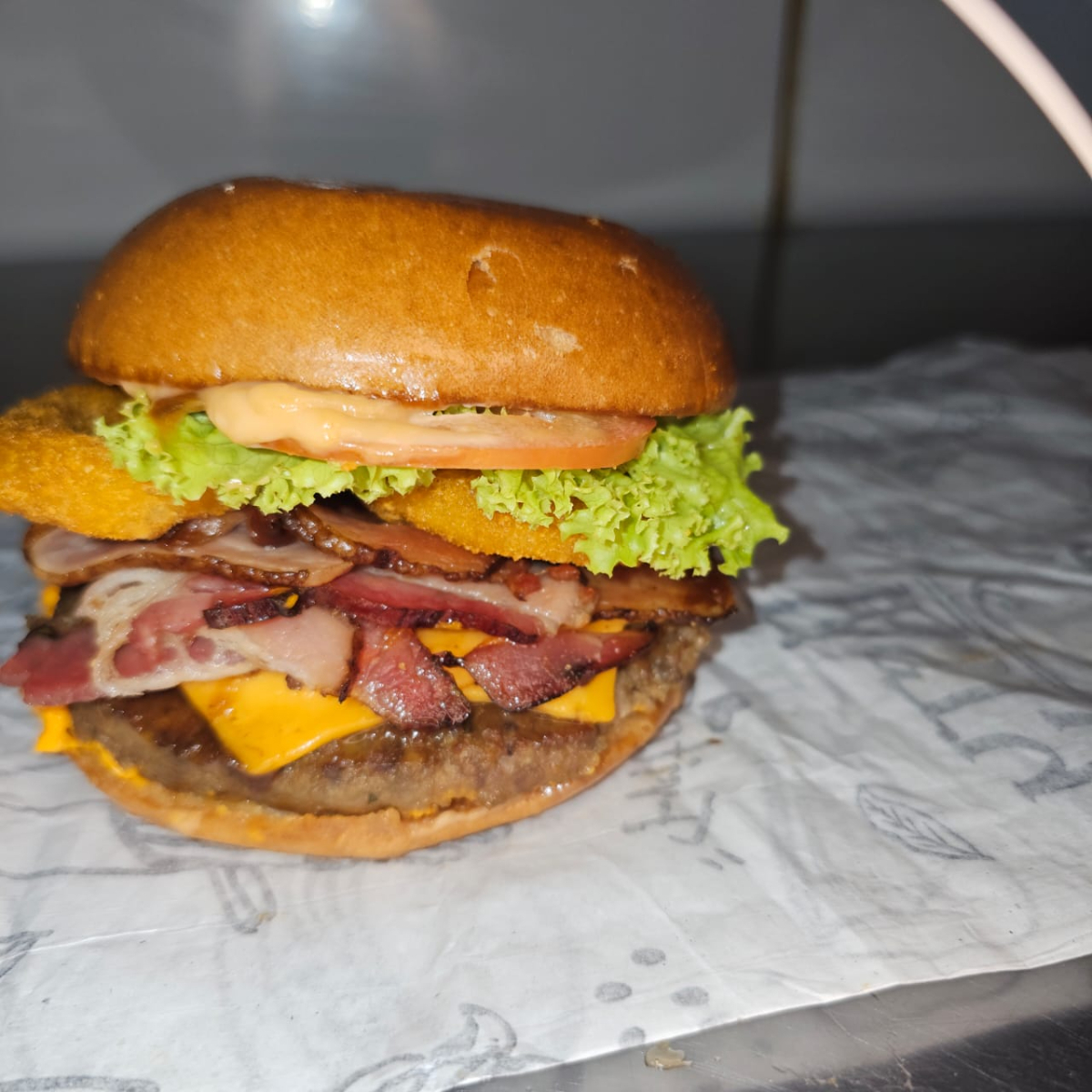 pao,3 hambuguer 120g, cheddar ,bacon,cebola empanada e salada