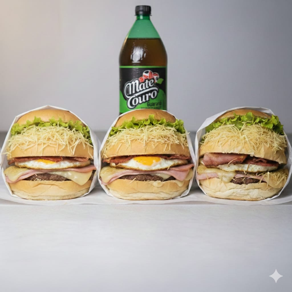 Pão, carne de boi, ovo, queijo, bacon, milho, batata palha e salada + Mate couro 2 Litros