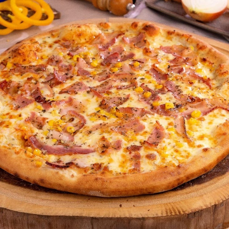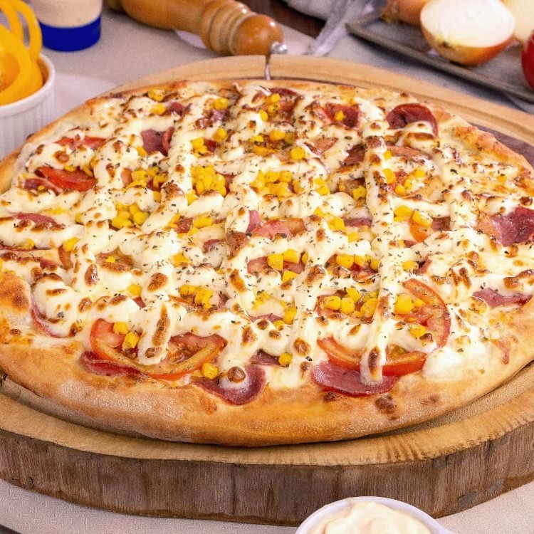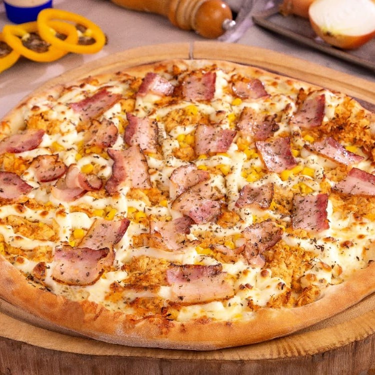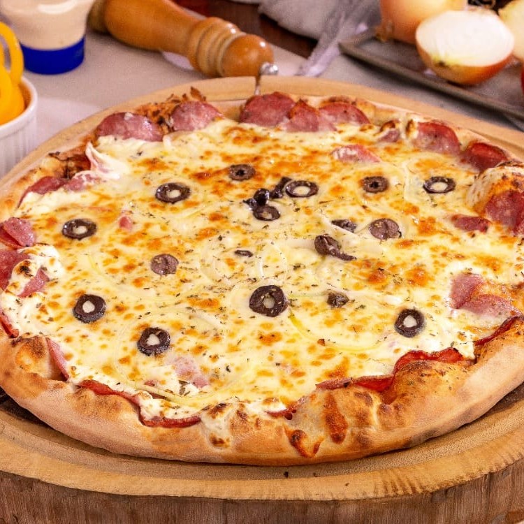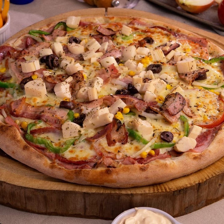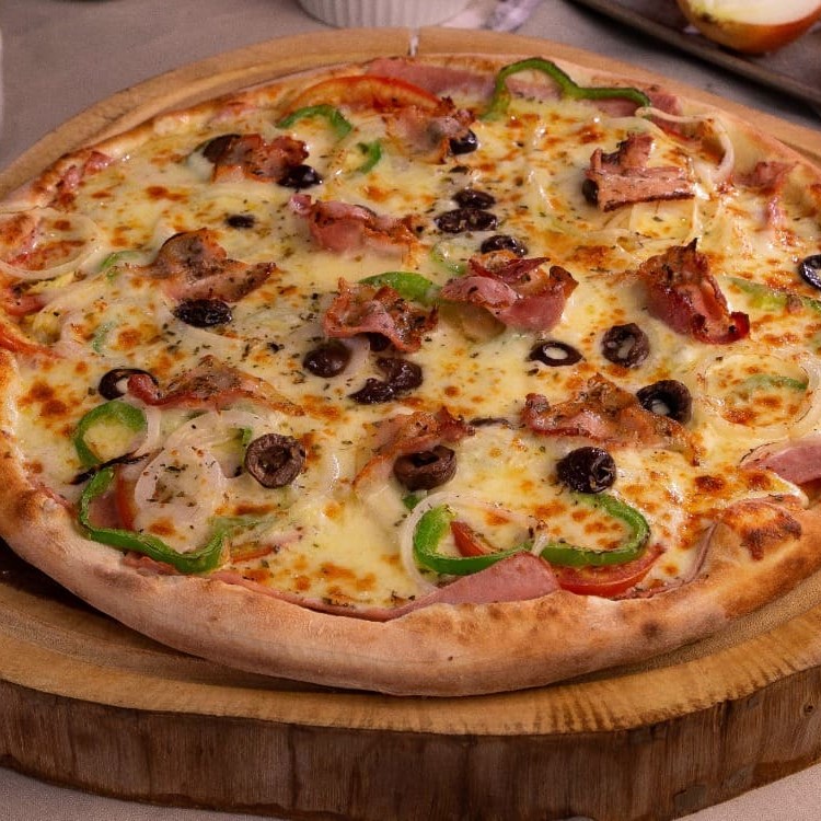 Molho ao sugo, presunto, calabresa, tomate, pimentão, cebola, azeitona, bacon, mussarela e orégano.