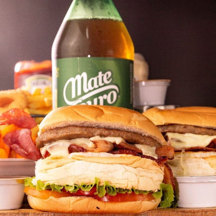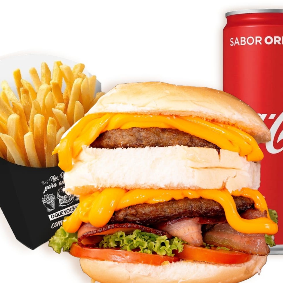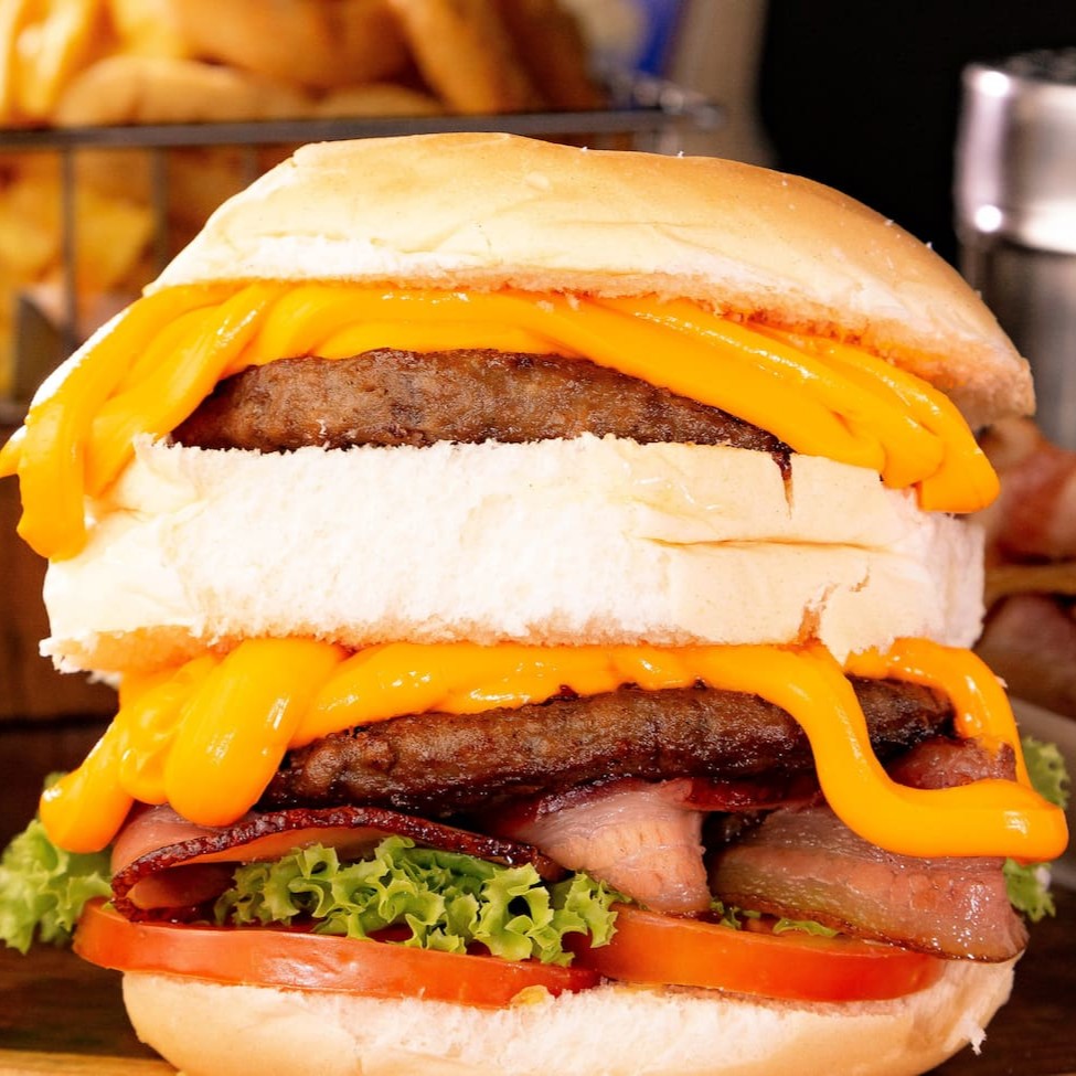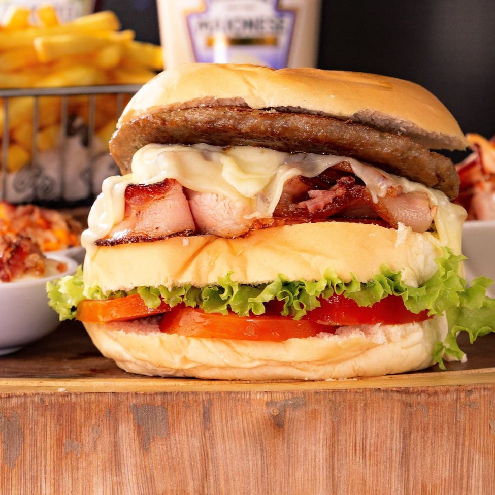 Pão, 2 hambúrguer de picanha 120g, cheddar, mussarela, bacon, alface e tomate.