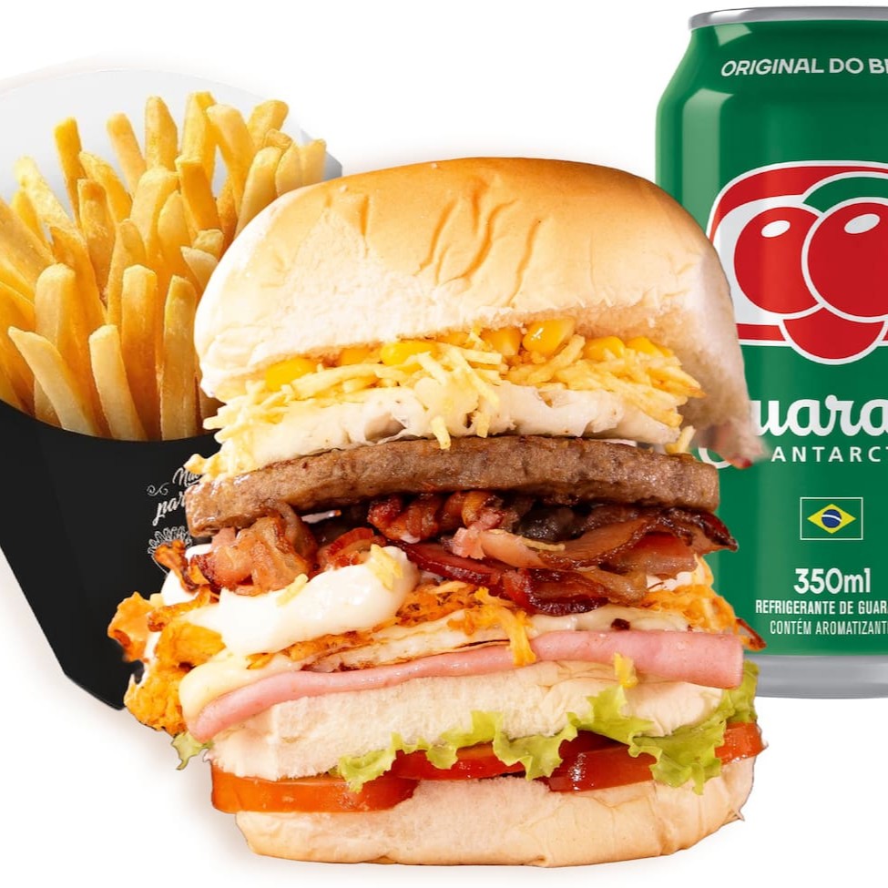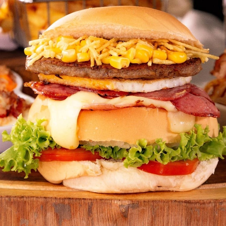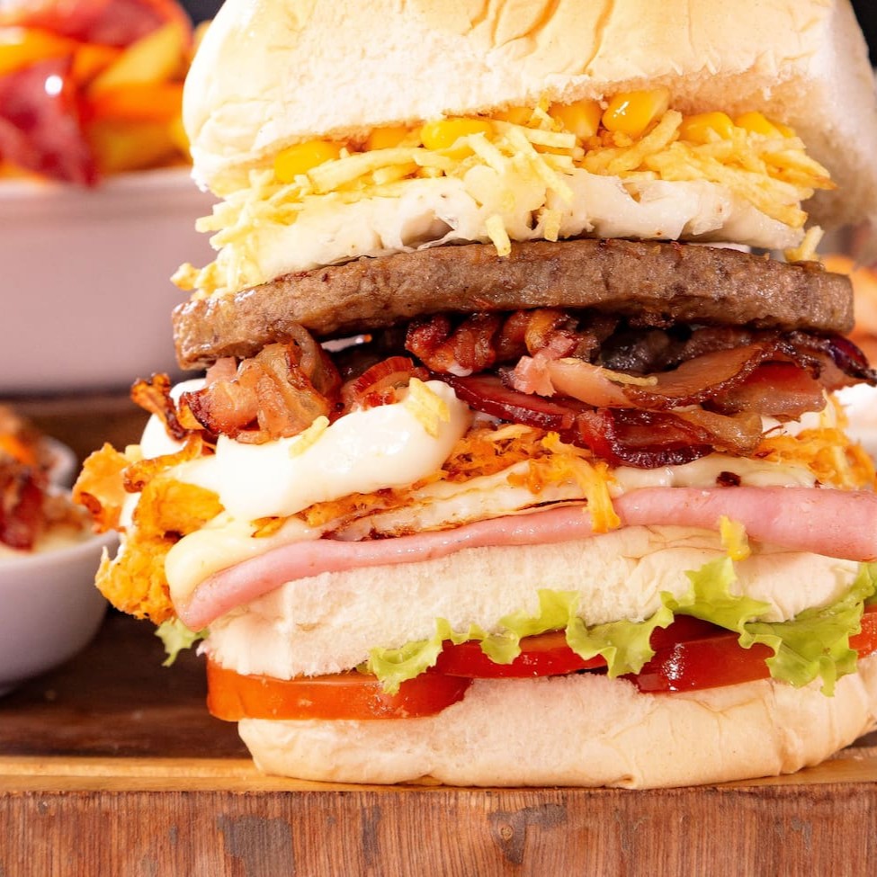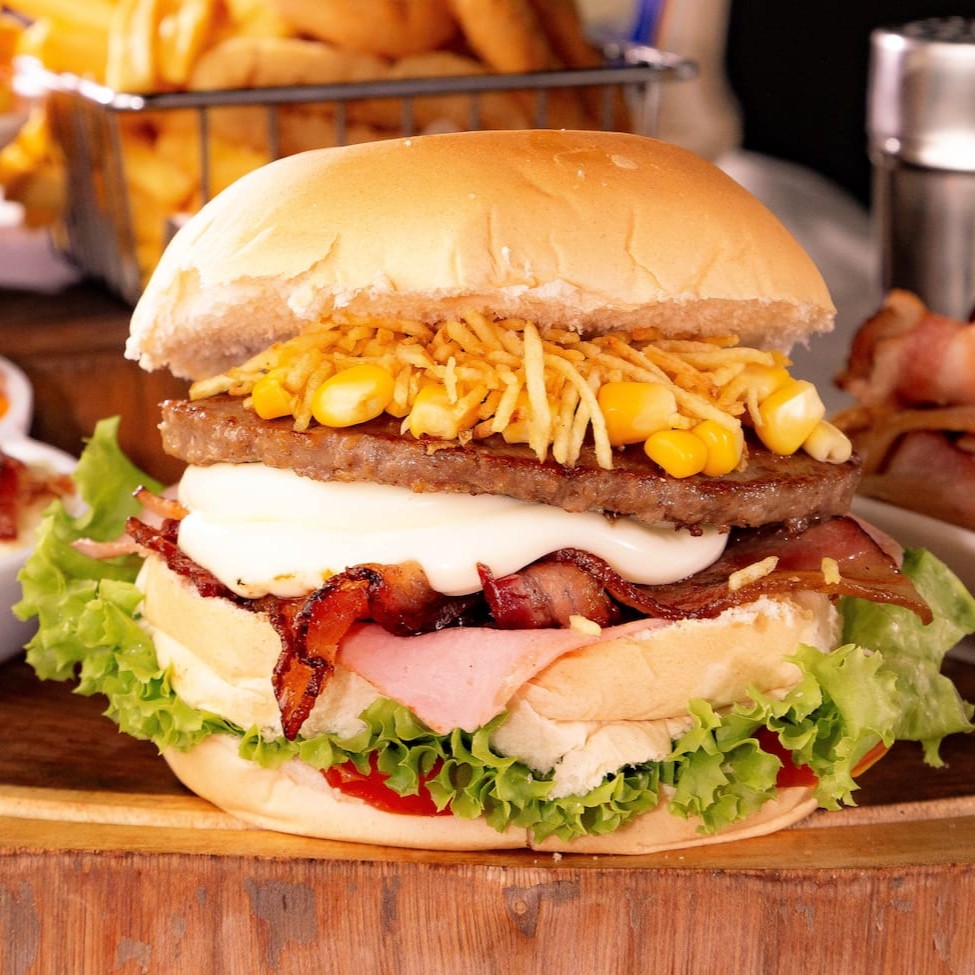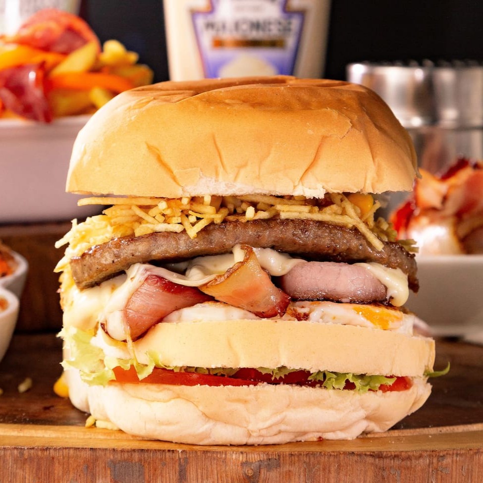 Pão, hambúrguer 120g, ovo, bacon, mussarela, presunto, bacon, batata palha e milho.