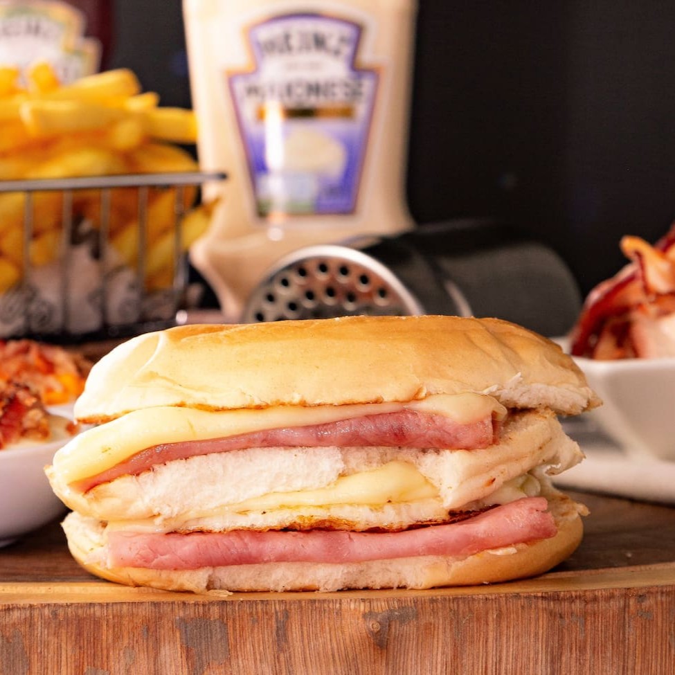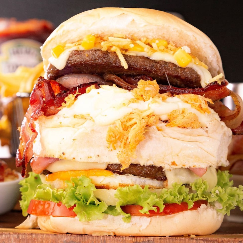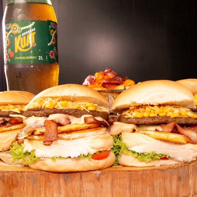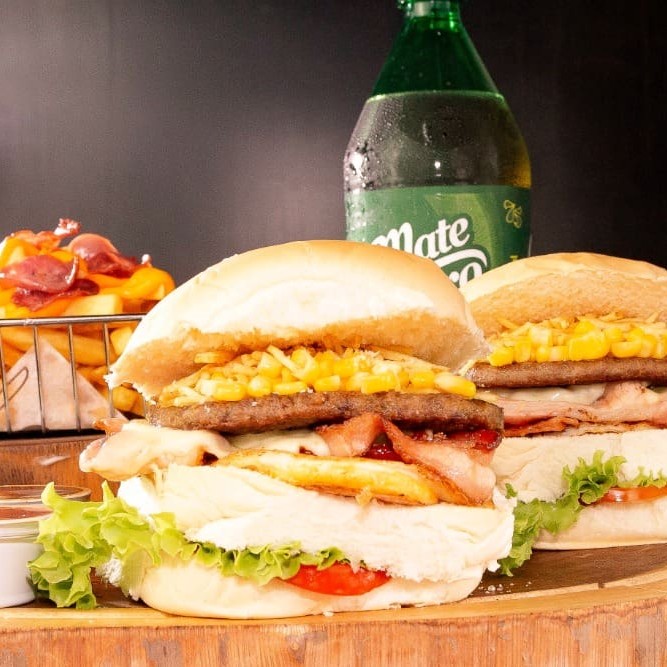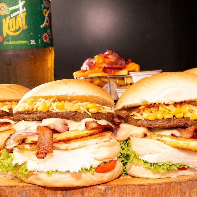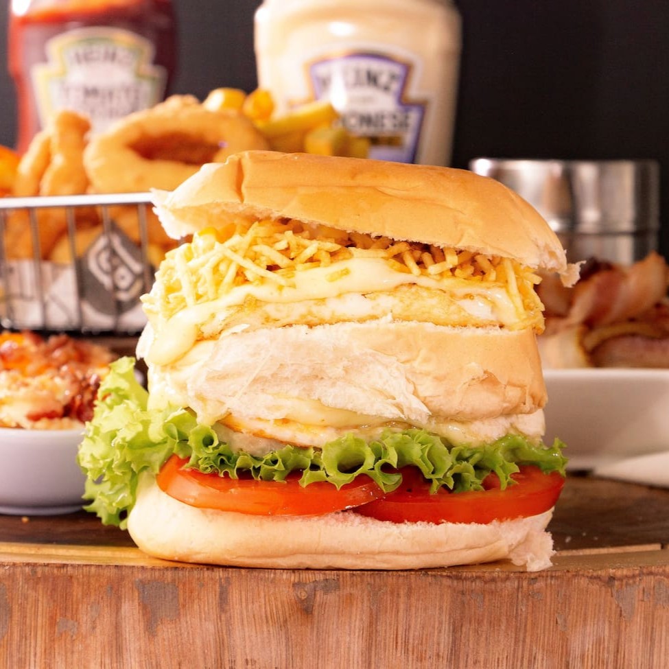 Pão, hambúrguer 120g, ovo, bacon, mussarela, presunto, bacon, batata palha e milho.