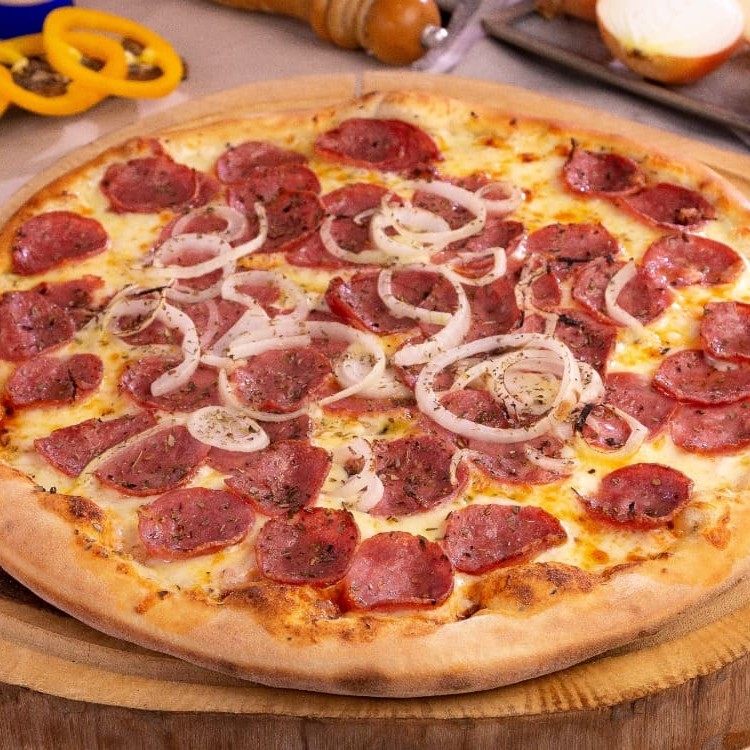 Molho ao sugo, Clabresa, cebola, mussarela e orégano. ( Tamanho 35cm, 8 fatias )