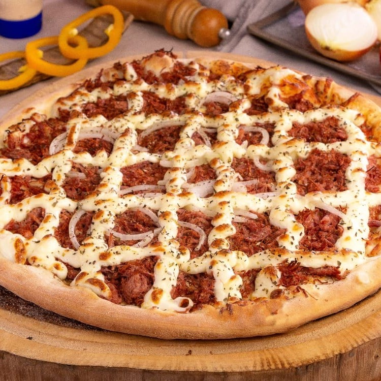 Molho ao sugo, carne seca desfiada, cebola, Catupiry Original, mussarela e orégano.