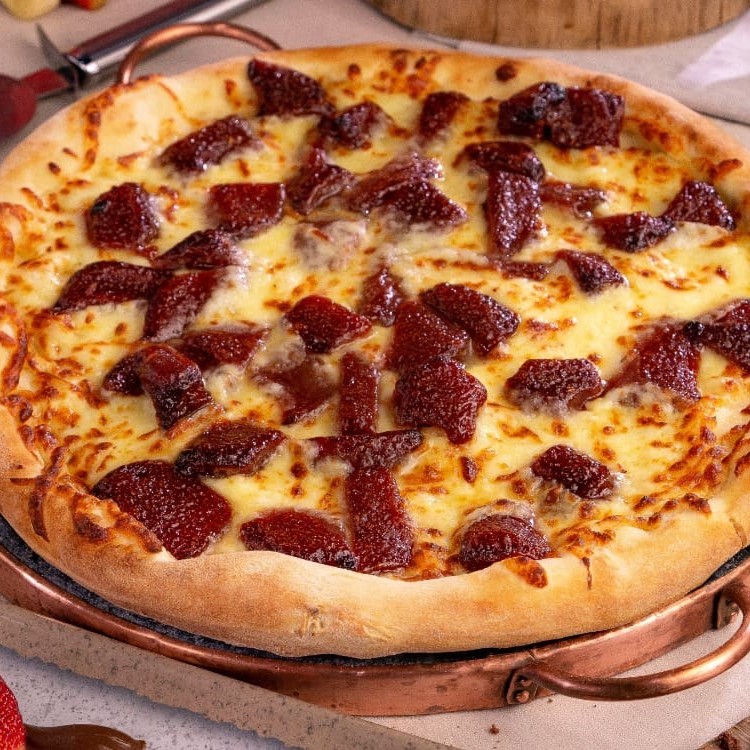 Molho ao sugo, mussarela, peito de peru, bacon, cream chesse, geleia de damasco e orégano.