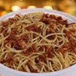 Espaguete, molho à bolonhesa, bacon, frango desfiado, milho, Catupiry e parmesão.