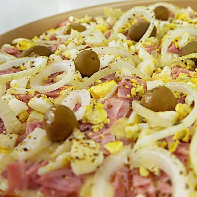 Presunto, cebola, ovo, azeitona, mussarela e orégano