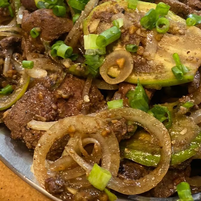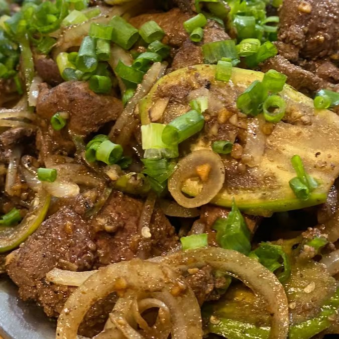 Fígado sempre novinho, saboroso acompanhado de Cebola e Jiló